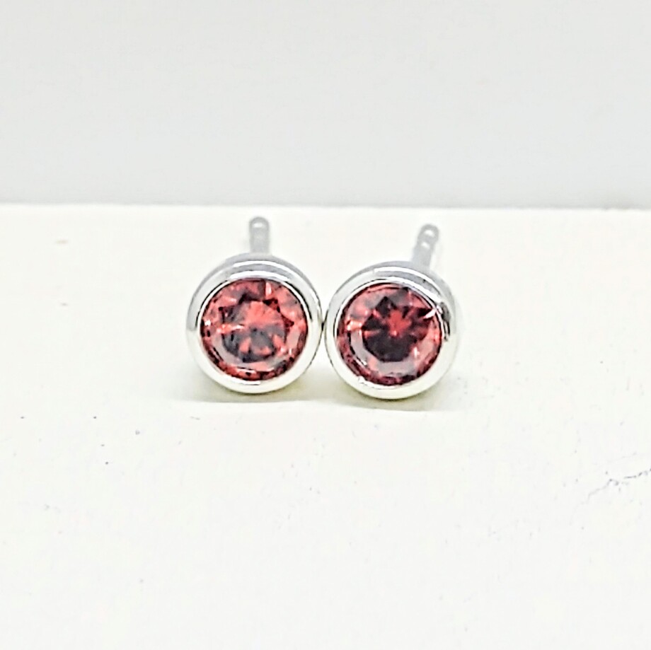 Solid silver with garnet coloured crystal in a bezel setting.
