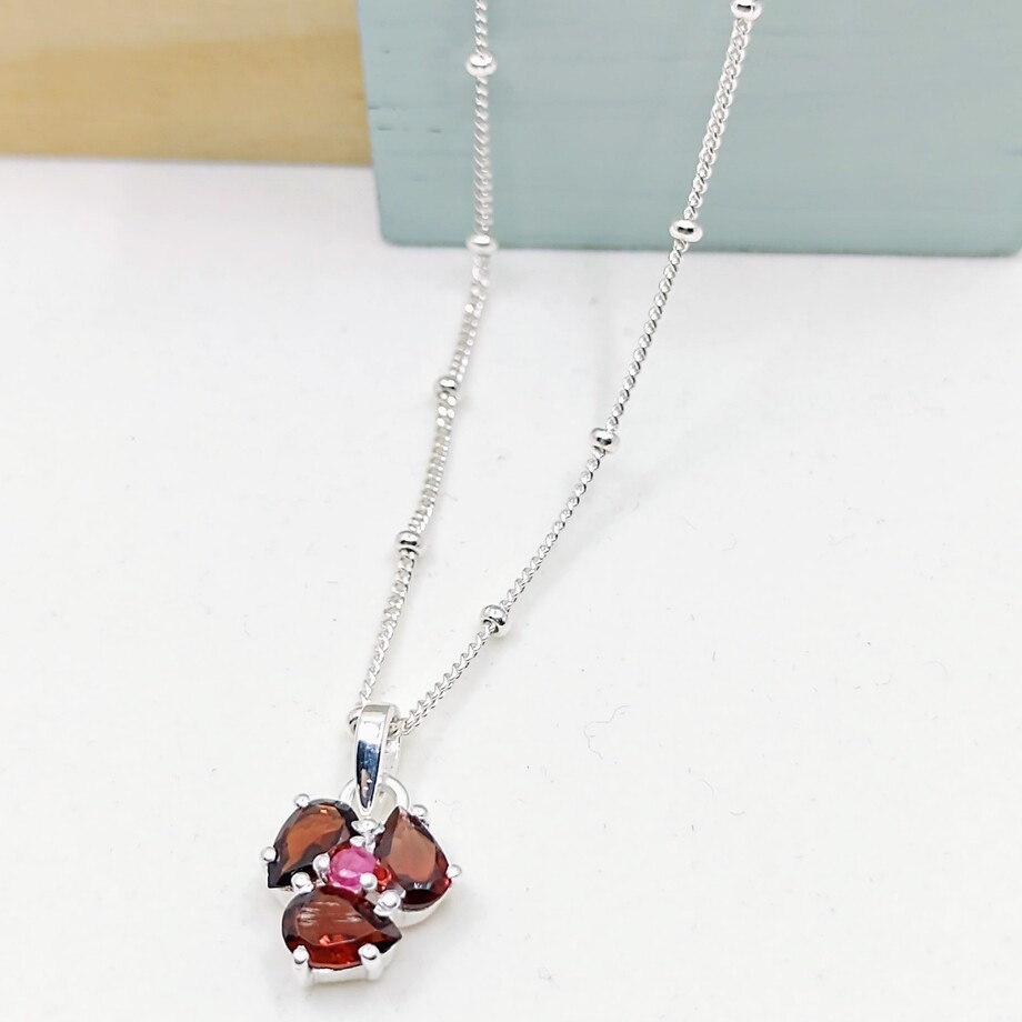 Home » Hidden » Silver and gemstone » Garnet and ruby clover pendant
